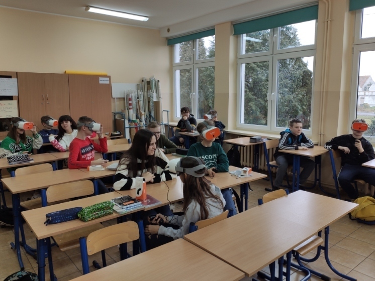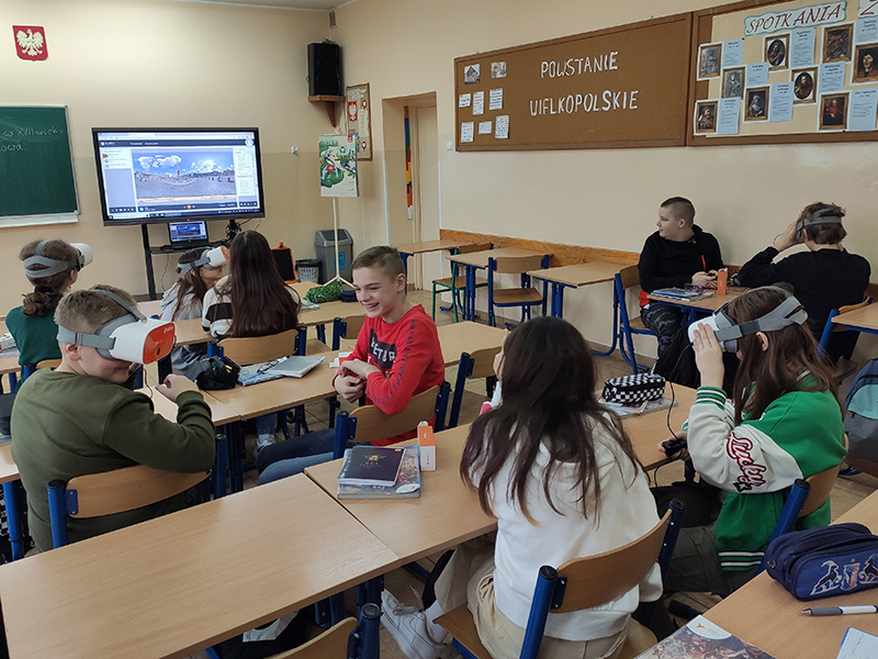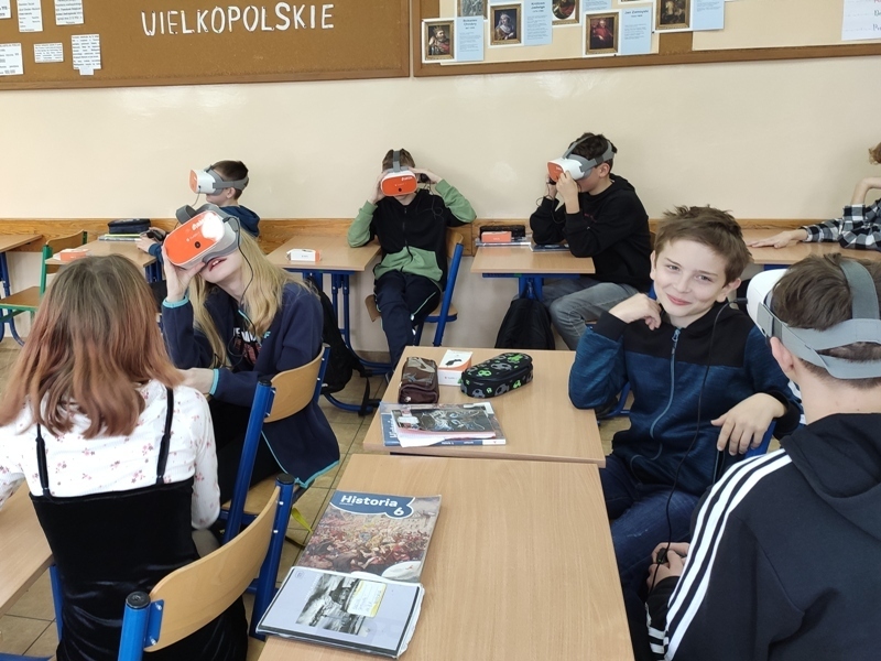 Uczniowie klas szóstych podczas zajęć historii poznawali zabytki i malarstwo baroku. Dzięki goglom VR przenieśli się do Watykanu, gdzie odbyli wirtualny spacer po Placu św. Piotra, podziwiając otaczające go kolumnady zaprojektowane przez barokowego włoskiego architekta Berniniego. Następnie znaleźli się w muzealnych wnętrzach, gdzie zapoznali się z barokowym malarstwem. Podziwiali sztukę barokową, w tym obrazy, na których został zastosowany światłocień, często używany przez ówczesnych malarzy. Lekcja ta wzbudziła wiele emocji wśród uczniów, którym na pewno jeszcze zdarzy się „cofnąć w czasie” i odbyć kolejny wirtualny spacer.