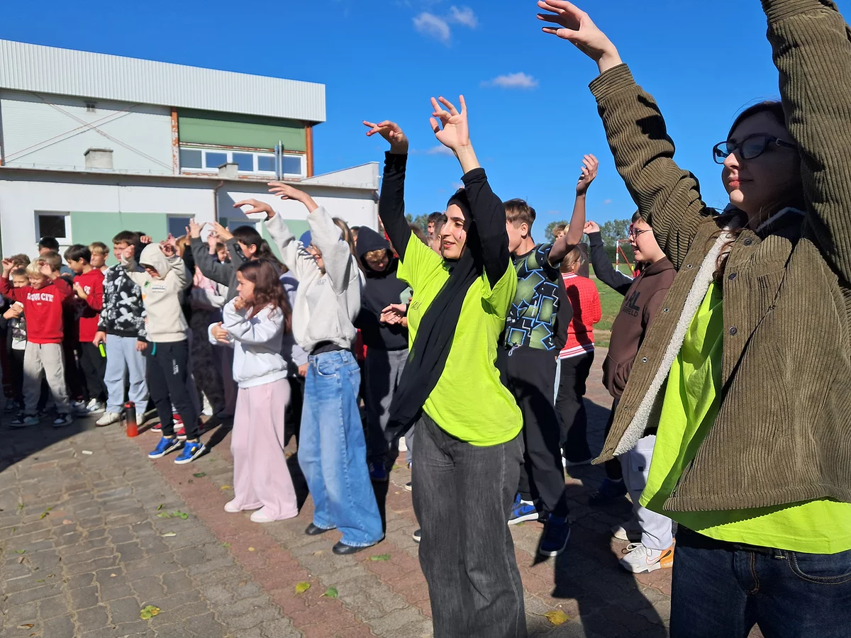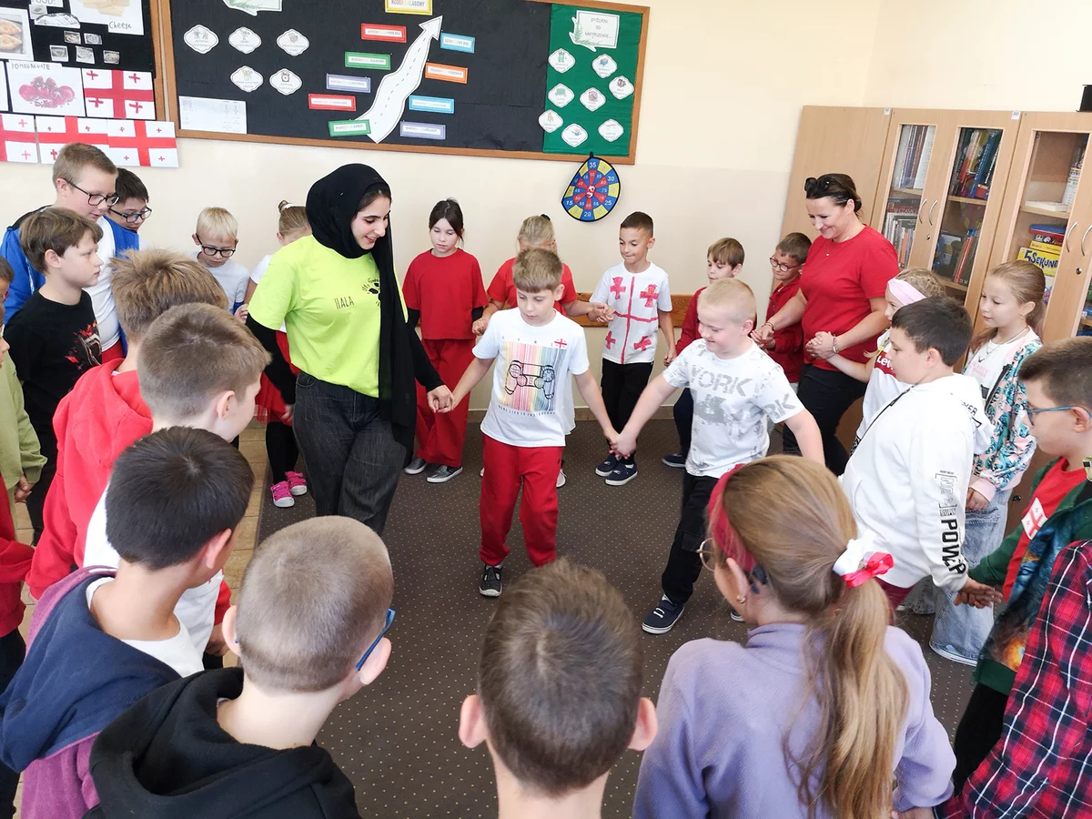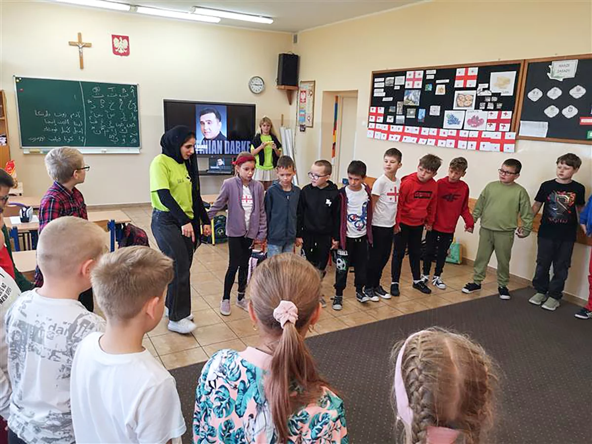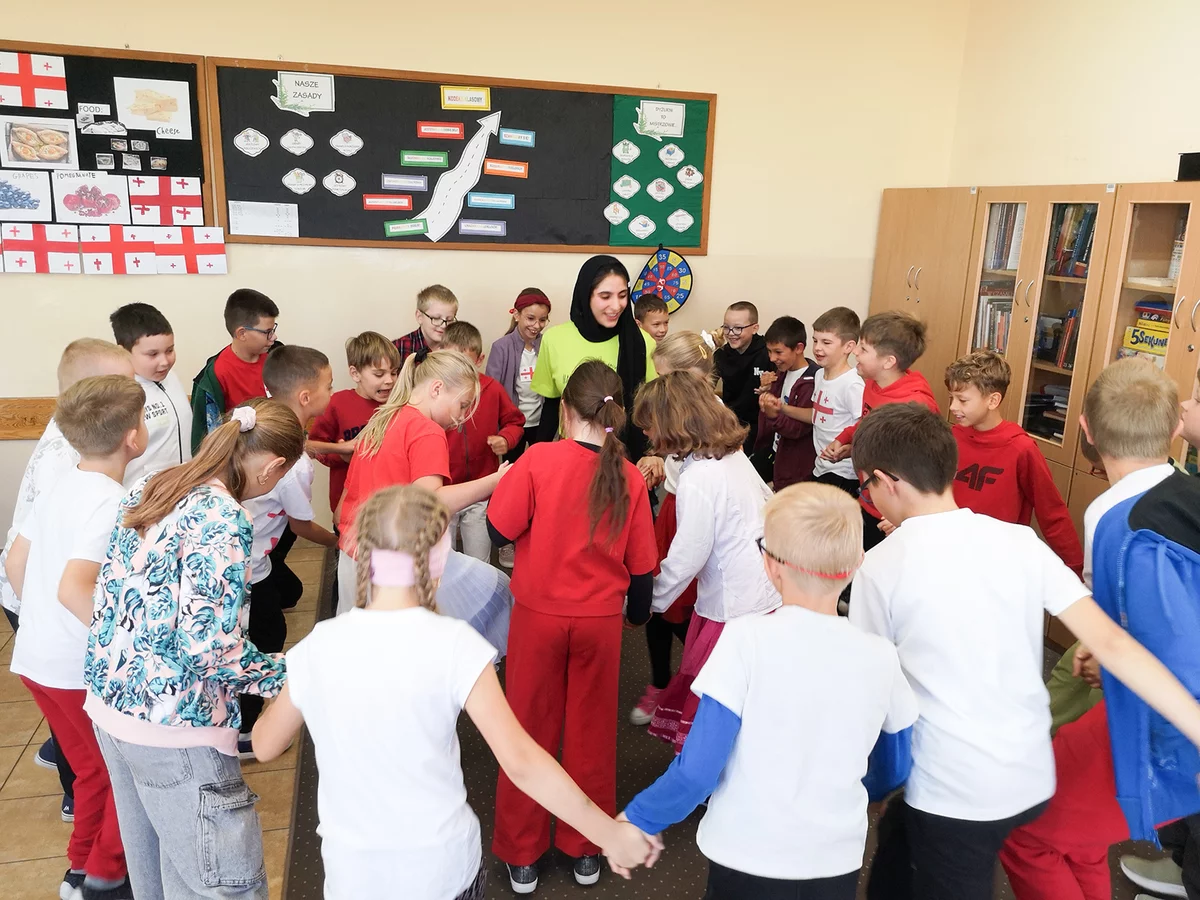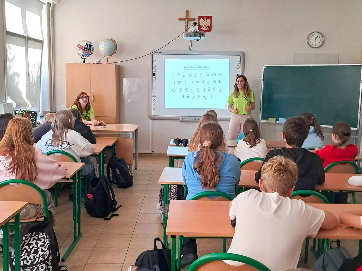 Jak co roku we wrześniu obchodziliśmy Dzień Języków Obcych. Z tej okazji odwiedzili nas specjalni goście - wolontariusze z Centrum Aktywności Twórczej: Nino, Khatia i Sofi z Gruzji oraz Hala z Jordanii. Dziewczyny spotkały się z uczniami podczas lekcji i przedstawiły niezwykle ciekawe prezentacje na temat swojej ojczyzny. Uczestnicy zajęć poznali tradycyjne potrawy, muzykę i sztukę zaproszonych gości, mieli okazję porozmawiać w języku angielskim, poćwiczyć gruziński alfabet oraz poznać kroki tradycyjnego tańca naszych gości. W trakcie jednej z przerw dziewczyny zaprosiły uczniów do wspólnego tańca, co wywołało duży entuzjazm.
