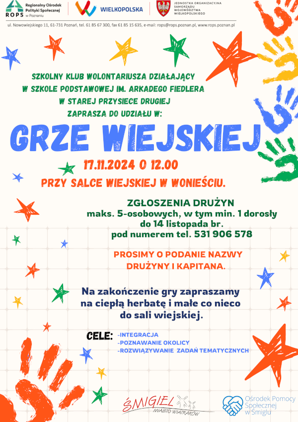 Szkolny Klub Wolontariusza działający w Szkole Podstawowej im. Arkadego Fiedlera w Starej Przysiece Drugiej zaprasza do udziału w GRZE WIEJSKIEJ 17.11.2024 o 12.00 przy salce wiejskiej w Wonieściu. Zgłoszenia drużyn maks. 5-osobowych, w tym min. 1 dorosły do 14 listopada br. pod numerem tel. 531 906 578. Prosimy o podanie nazwy drużyny i kapitana.