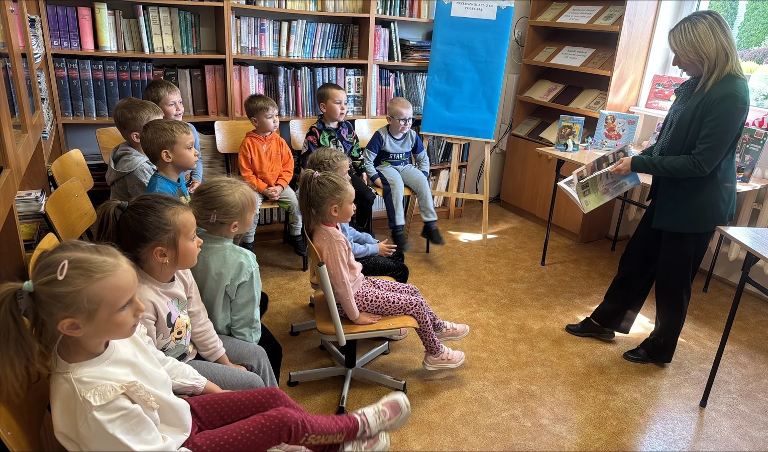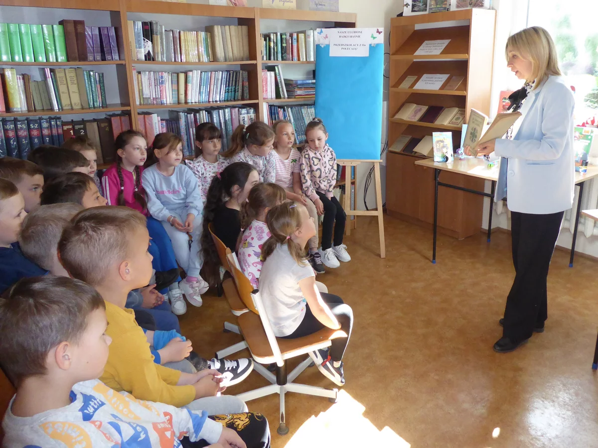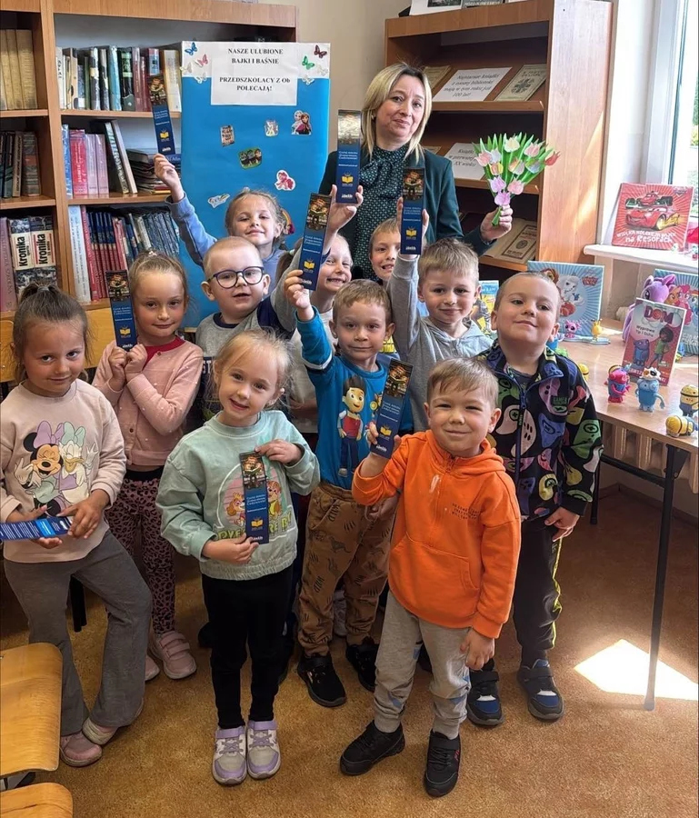 Duże zainteresowanie wzbudziła baśń „Królowa pszczół” braci Grimm przedstawiona w formie teatrzyku kamishibai. Na zakończenie dzieci przykleiły obrazki z wybranymi książkami na tablicach „Nasze ulubione bajki i baśnie – przedszkolacy polecają”, dzieląc się swoimi ulubionymi tytułami. Na pamiątkę otrzymały kolorowe zakładki, aby mogły z nich korzystać podczas wspólnego, rodzinnego czytania bajek.