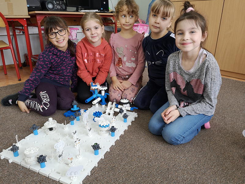 W czasie zajęć dydaktycznych i przerw śródlekcyjnych dużą popularnością cieszą się klocki Korbo. Uczniowie klasy 1aP zaprojektowali ciekawe miejsca na rodzinne wycieczki. Dziewczynki zbudowały arktyczne zoo na rodzinne spacery, a chłopcy dwupoziomowy garaż z ekspozycją pojazdów wojskowych i rolniczych. Dzieci z klasy 1bP używały klocków do układania schematów podczas utrwalania wiadomości o samogłoskach i spółgłoskach. Klasa 2aP wykorzystała swoje umiejętności konstrukcyjne do zbudowania miasteczka drogowego, a 3aP przejazdu kolejowego na zajęciach prowadzonych w ramach kampanii „Bezpieczny przejazd”.