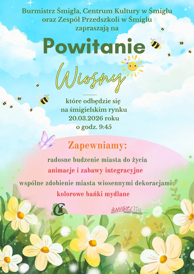 Burmistrz Śmigla, Centrum Kultury w Śmiglu oraz Zespół Przedszkoli w Śmiglu zapraszają na Powitanie Wiosny, które odbędzie się 20 marca 2026 r. o godz. 9.45 na śmigielskim rynku.