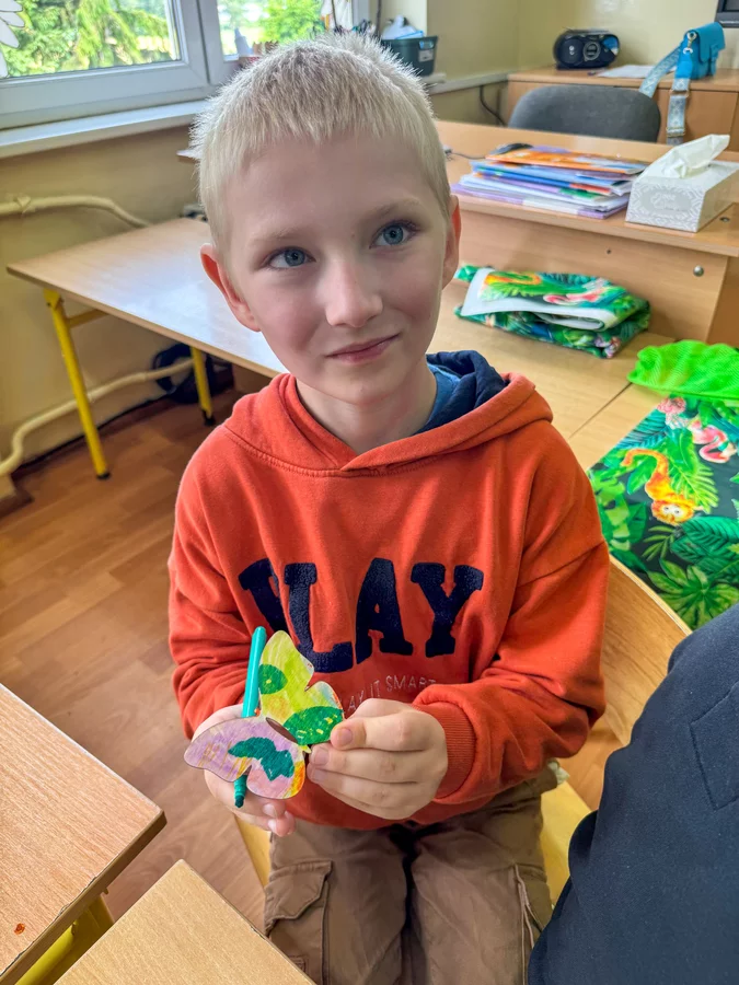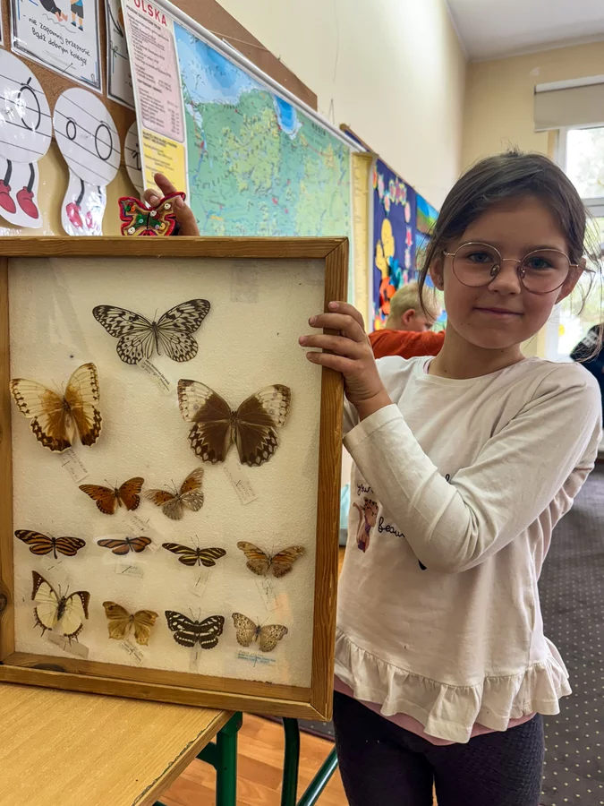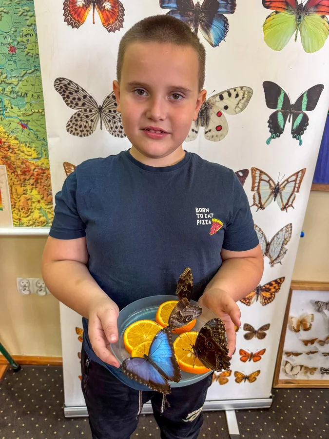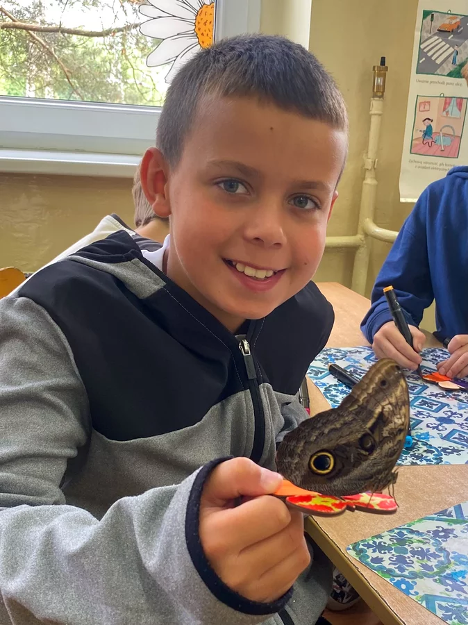 Dzieci klas 1-3 brały udział w inspirujących warsztatach. W trakcie zajęć uczniowie dowiedzieli się wiele o fascynującym świecie motyli – ich życiu, środowiskach występowania oraz różnorodności gatunków; mogli dotykać, oglądać i podziwiać prawdziwe okazy motyli, a także przeglądali zdjęcia przedstawiające ich różne gatunki. Z zaangażowaniem wykonano prace plastyczne – malowano i zdobiono drewniane motyle. Nie zabrakło nauki przez zabawę – dzieci oglądały motyle pod mikroskopem, korzystały z zabaw ruchowych i mogły poczuć się jak w kokonie, wchodząc do specjalnego tunelu.