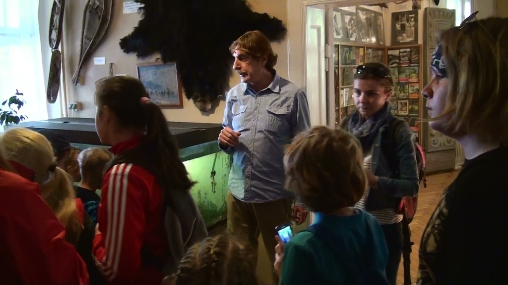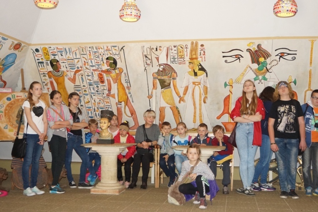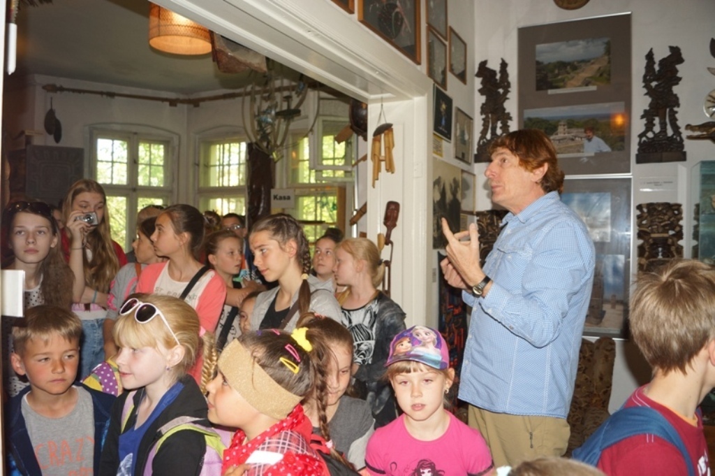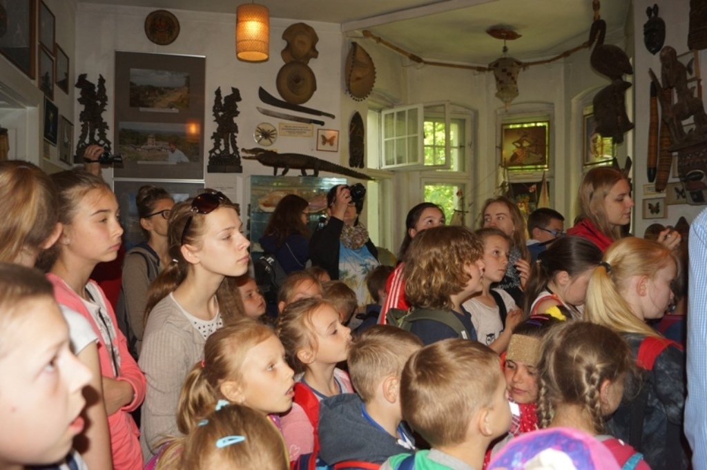 Zwiedzanie rozpoczęto od ekspozycji wewnętrznej, czyli domu podróżnika, gdzie „w czterech pomieszczeniach zamknął się barwny świat, zbiegły się kontynenty”. Naszym przewodnikiem był pan Marek Fiedler – syn Arkadego.