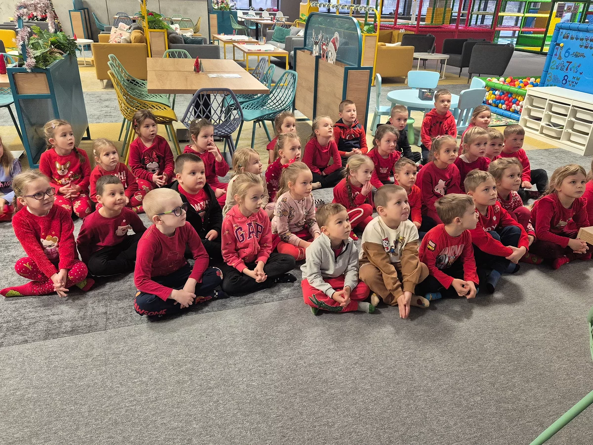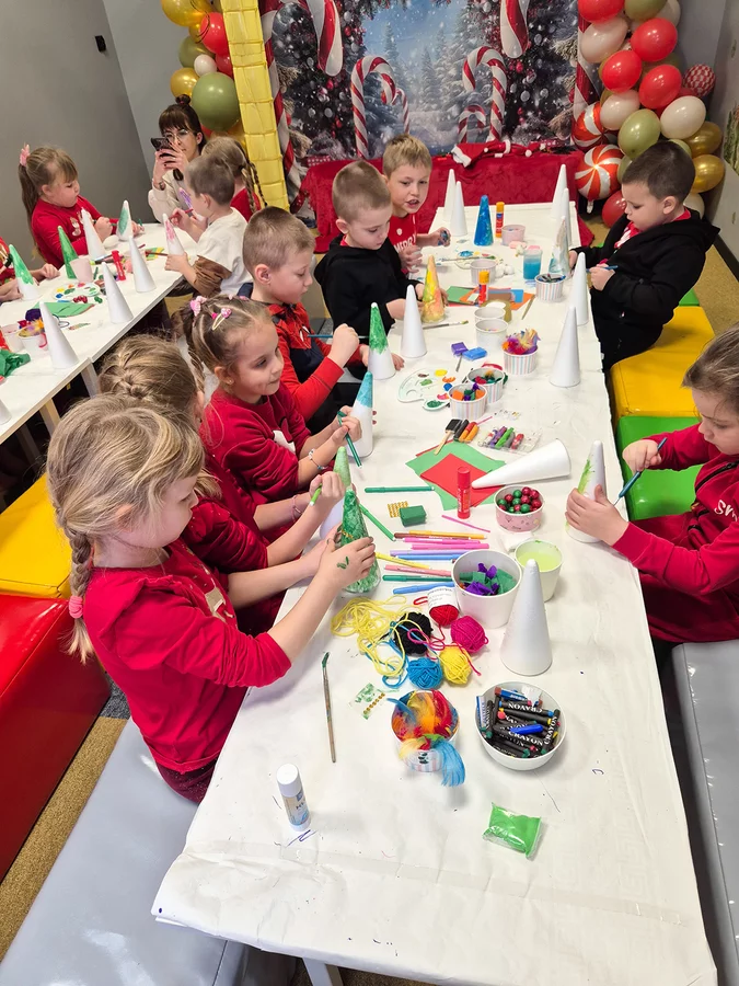 Od samego początku towarzyszyły im uśmiechy, ciekawość i prawdziwie świąteczny nastrój. Przedszkolaki wzięły udział w warsztatach świątecznych, podczas których z wielkim zaangażowaniem wykonały piękne, kolorowe choinki. Następnie pracowano w grupach, kolorując postacie elfów, rozwijając swoją kreatywność, współpracę i zdolności plastyczne. Nie zabrakło również czasu na wesołą zabawę. Dzieci z radością spędziły czas w basenie z kulkami, wspinały się po drabinkach, zjeżdżały na torze saneczkowym, a także uczestniczyły w emocjonującej zabawie polegającej na szukaniu wskazówek od elfa, co sprawiło im ogromną frajdę.